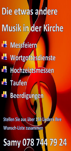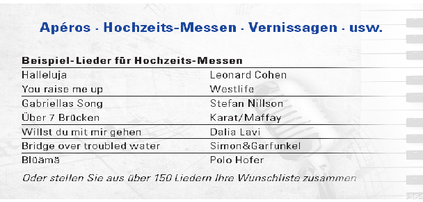 Stellen sie die passende Musik für ihren kirchlichen Anlass selber zusammen. Sei es für die Hochzeitsmesse z.B: Halleluja von Cohen - You raise me up - Bridge over troubled water ......